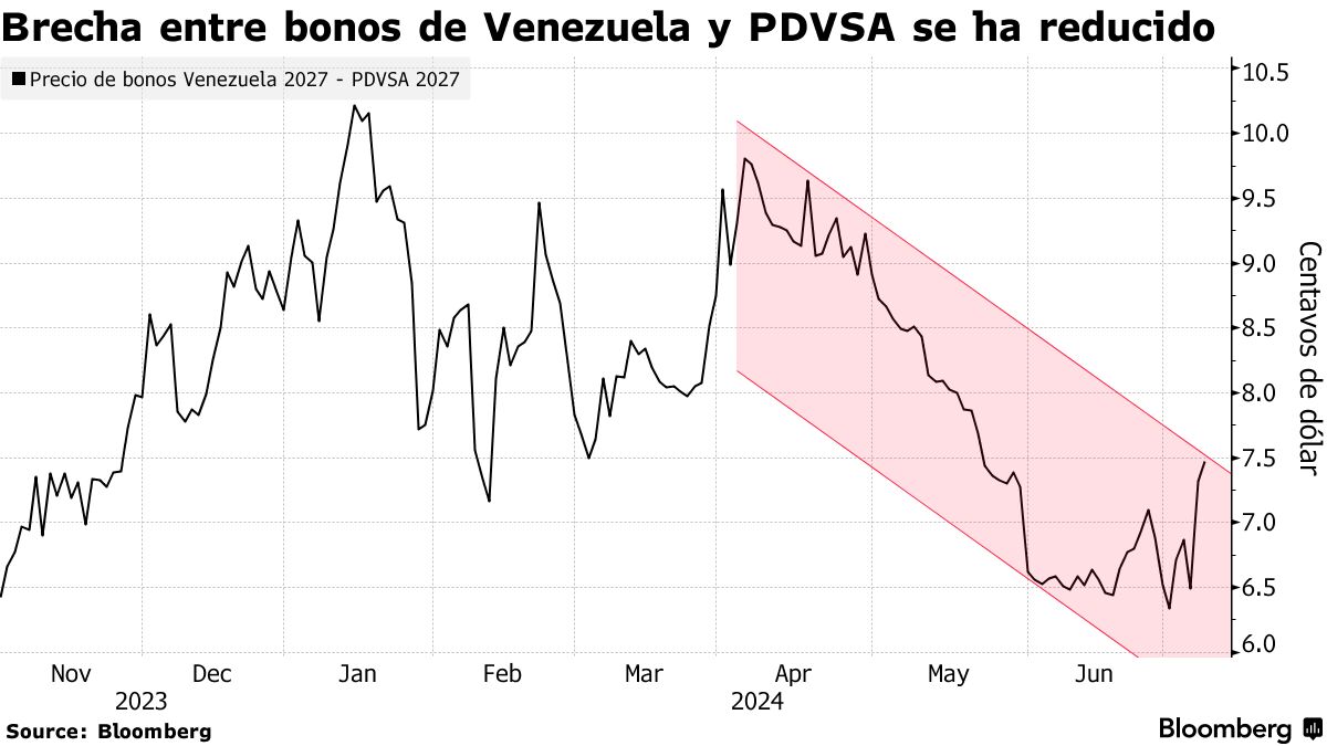 自那时以来,PDVSA和公共债务之间的利差已经降至去年11月以来未曾见过的水平,这是在美国解除在二级市场交易债务禁令后不久发生的。根据彭博社收集的交易员和价格数据,到2024年到期的PDVSA债券以约13美分的价格交易,过去三个月涨了约2美分。与之类似到期的国债以约18美分交易,与三个月前大致相同。