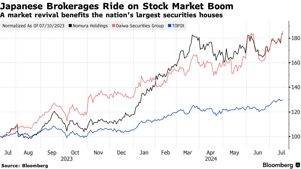 随着日本股市的蓬勃发展,未来几年券商业务稳定的前景帮助它们表现优于整体市场。野村证券今年迄今已上涨56%,大和证券上涨41%,超过了Topix指数的23%上涨。