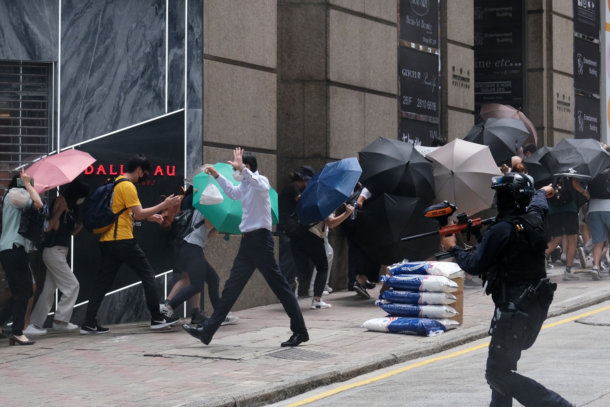 一名办公室职员提着午餐,举起双手走过中环,示威者和旁观者从香港2020年5月抗议活动中警察发射的辣椒喷雾弹中逃离。摄影师:Roy Liu/Bloomberg阅读更多:香港在全球金融中心的关键考验中踉跄