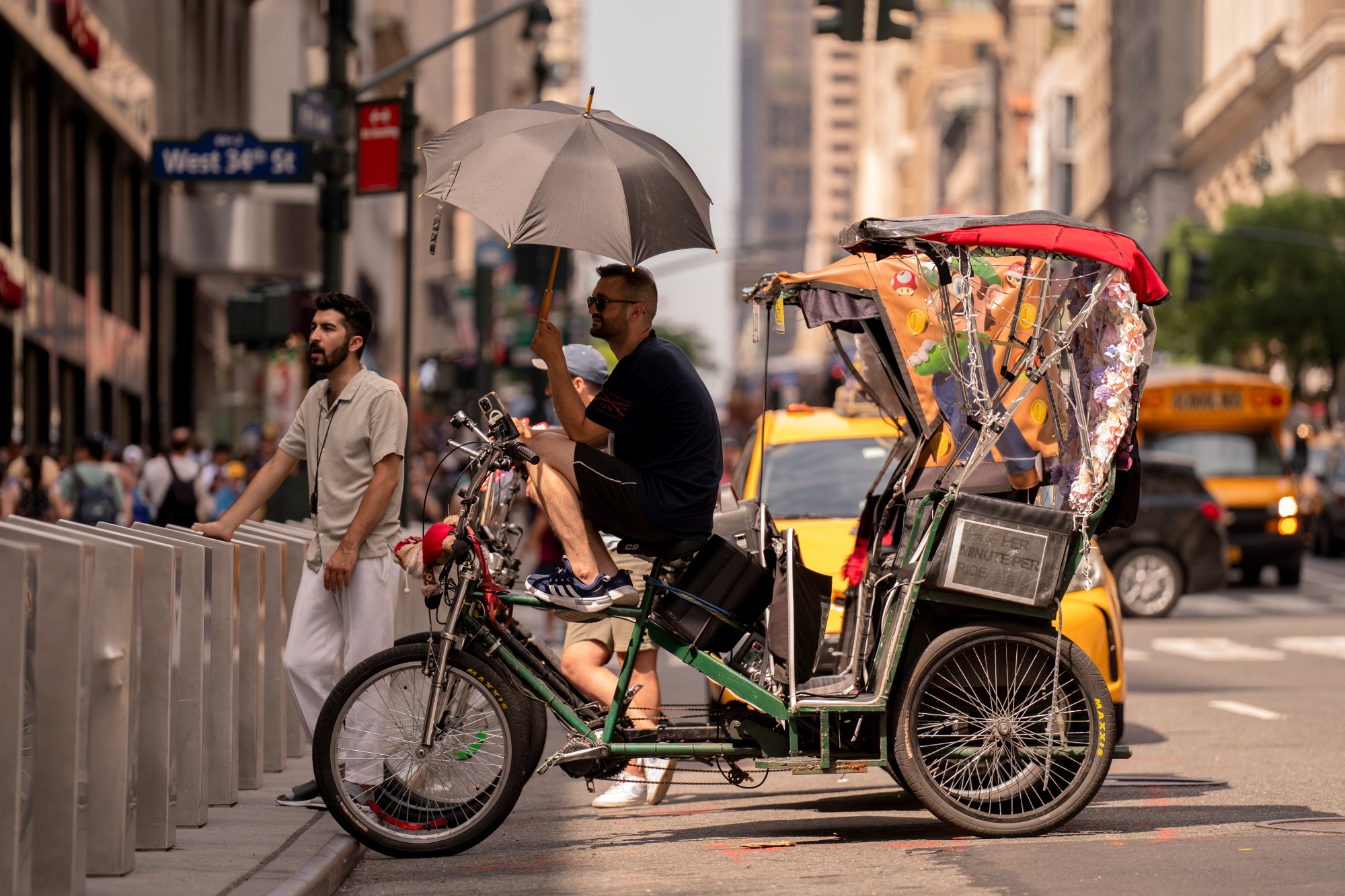 一名人力车夫在纽约高温天气中撑着伞。