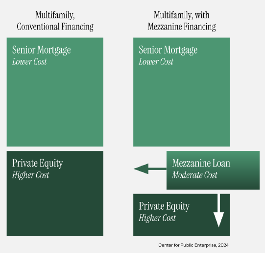 现在,正如他所说,开发商的标准公式是“你作为建筑商或开发商,投入建设成本的40%,你可以从银行获得建设成本的60%贷款。因此,你的权益被杠杆化为1.5比1,60/40。”但是,如果政府提供建设成本的20%作为中间融资,开发商就不必向项目注入太多资本。