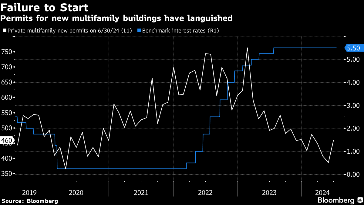 正如米尔斯坦所描述的,利率上升对住房开发商造成了双重打击。首先,随着债务成本的增加,建筑成本也会上升。其次,更高的利率会压缩资本化率 —— 用于衡量物业潜在回报的指标 —— 并降低完成项目的最终价值。