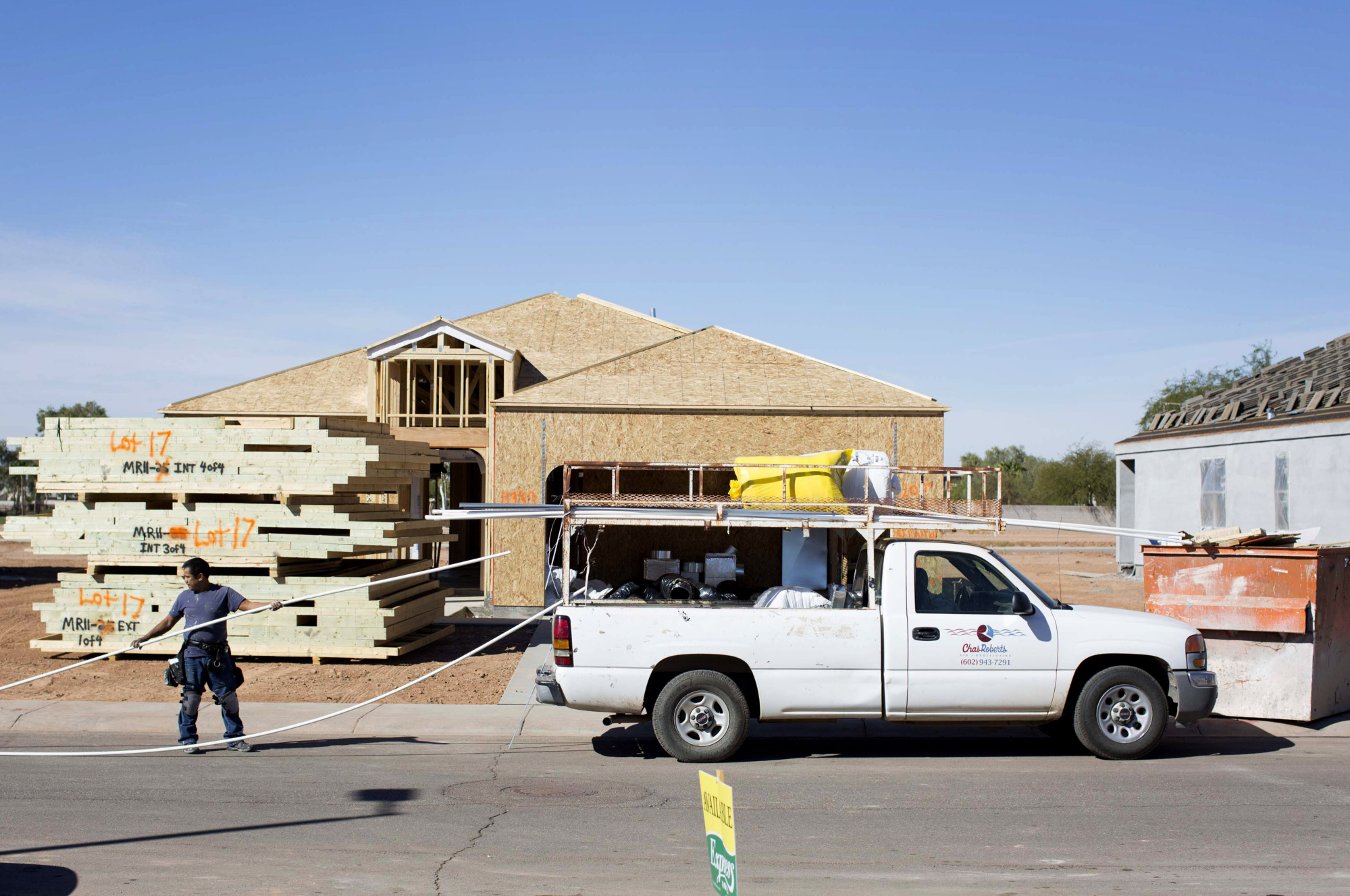 承包商在D.R.霍顿开发项目上将材料装上卡车。