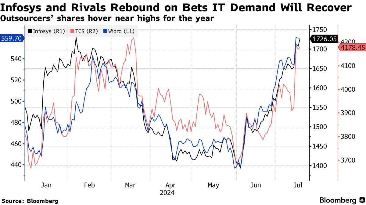 印度2500亿美元的软件服务行业,由塔塔咨询服务有限公司和印孚瑟斯领导,正在押注降息和通胀放缓将刺激技术支出。交易员押注美联储将在9月开始降息,而全球经济预计将在2024年增长3%,高于今年早些时候预计的2.7%,根据彭博经济学。亚洲最大的外包商塔塔咨询服务上周对更好的财政年度表示乐观,尽管对持续增长势头保持谨慎。
