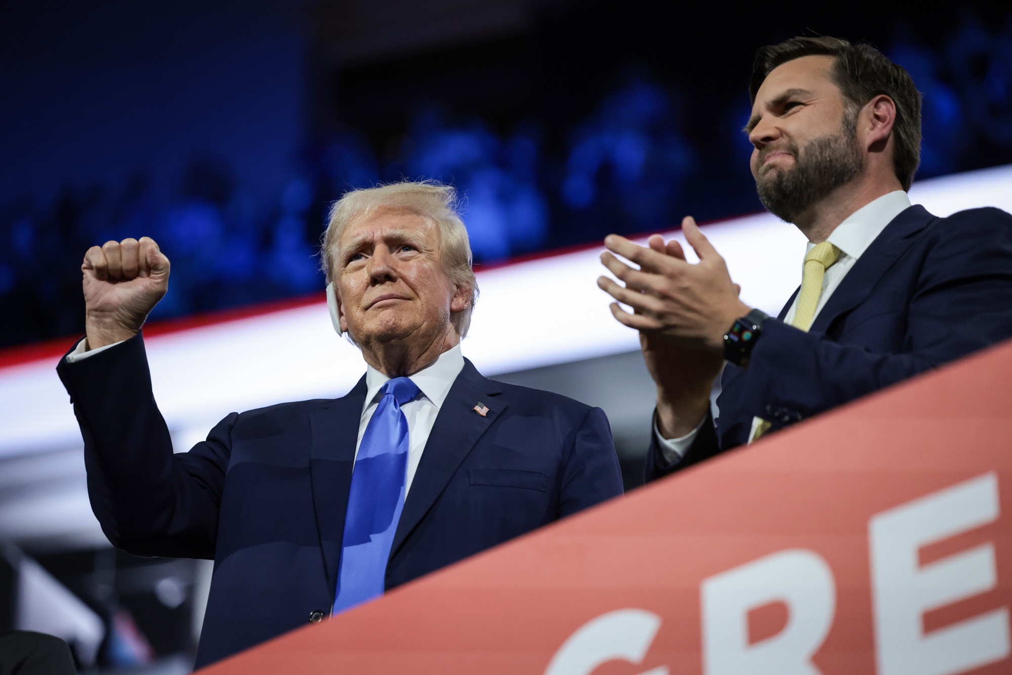 唐纳德·特朗普和JD Vance在威斯康星州密尔沃基费泽维尔论坛举行的共和党全国大会上。