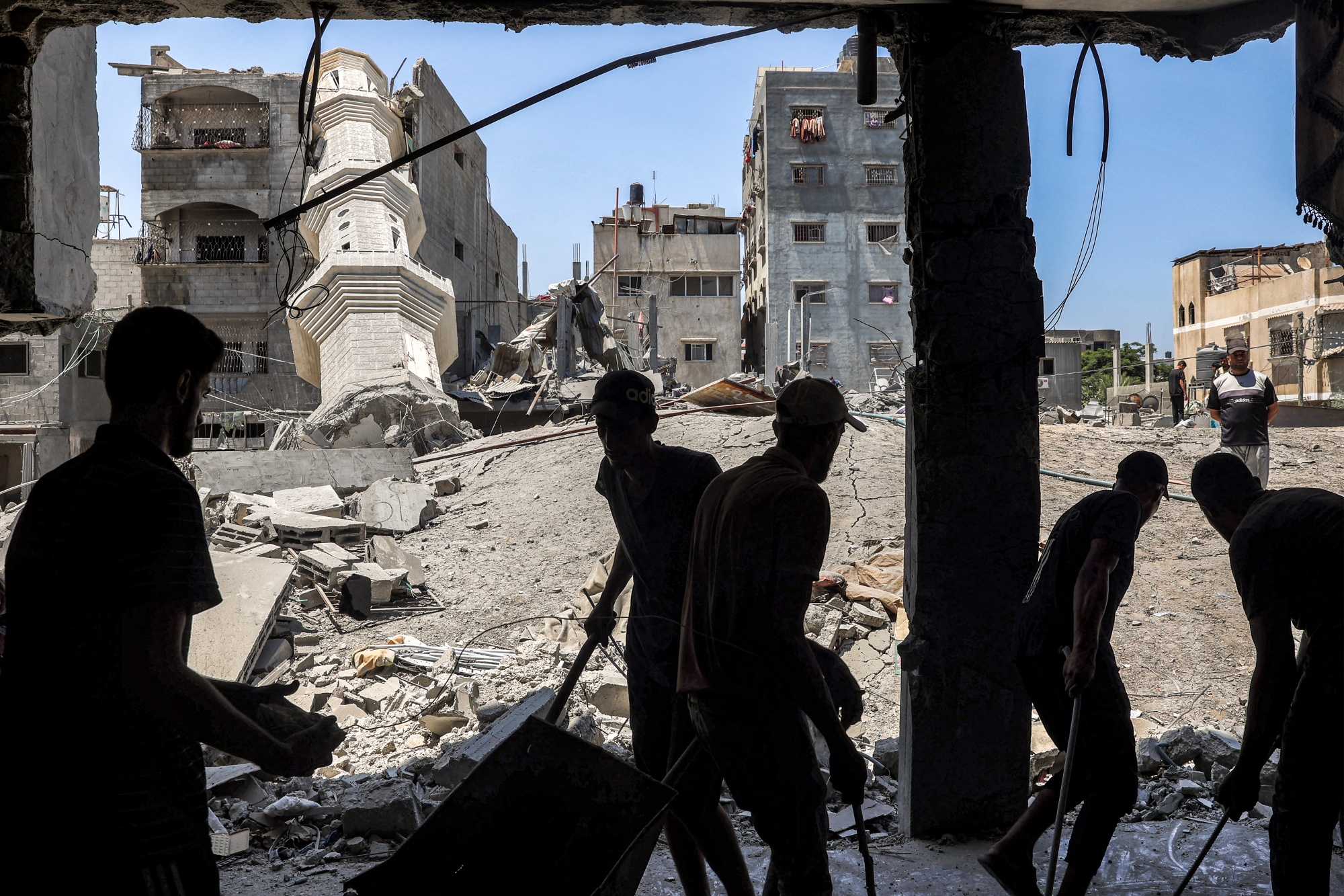 人们在加沙地带努赛拉特遭到以色列轰炸后搜索被摧毁建筑物的废墟。