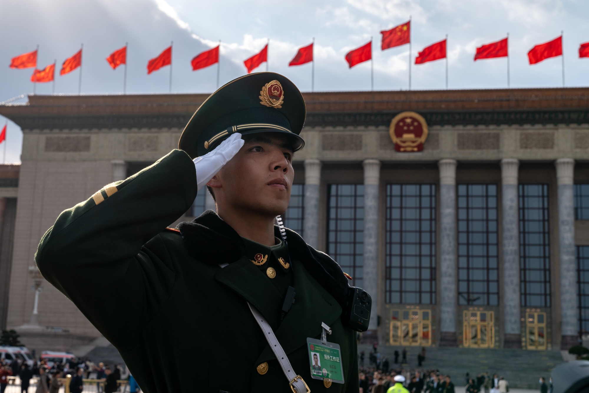 中国人民解放军一名成员在北京人民大会堂外行礼。