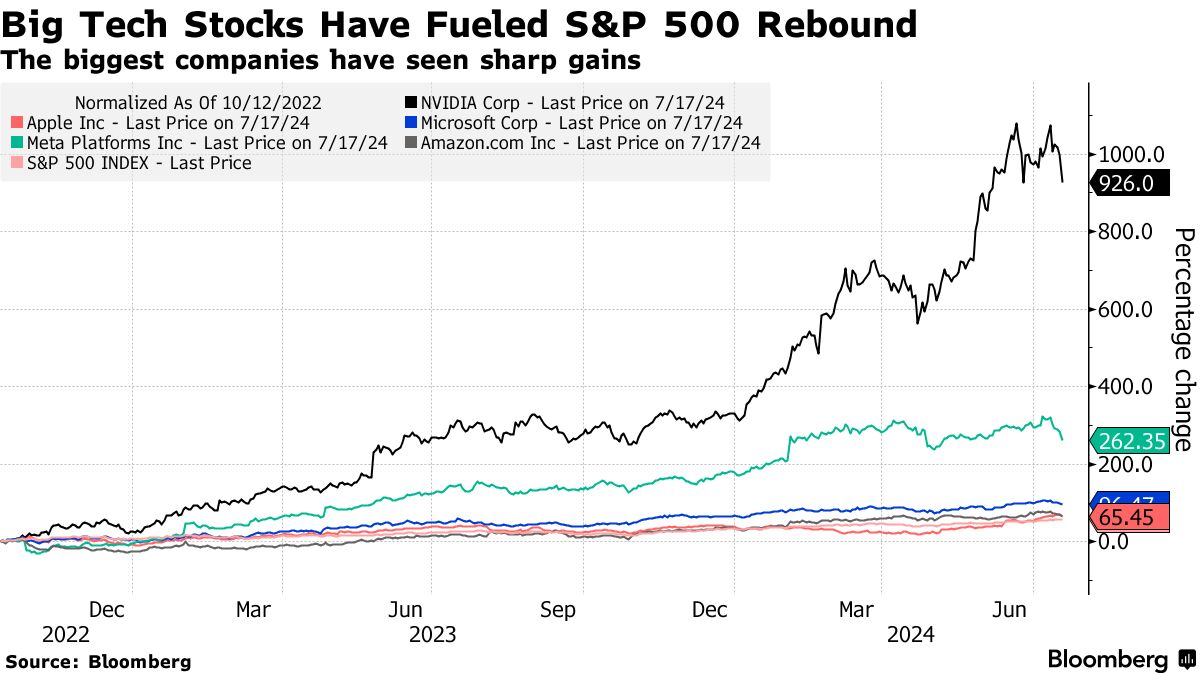 到目前为止,还没有迹象表明会发生这种情况。尽管周三科技股下跌,担忧芯片制造商将更深地卷入中美贸易战,但它们仍然保持在接近历史高位。自2022年10月触底以来,标普500指数的近一半涨幅集中在六只股票上:苹果公司、微软公司、英伟达、Alphabet公司、亚马逊公司和Meta平台。