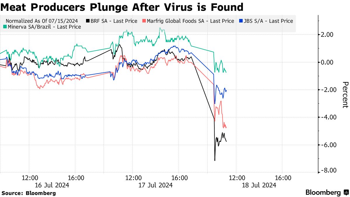 巴西最大的鸡肉供应商BRF股价暴跌7.9%,创下自去年11月以来的最大跌幅。而控制BRF的Marfrig股价暴跌9.1%,创下一年半以来的最大跌幅。与此同时,JBS下跌2.5%。