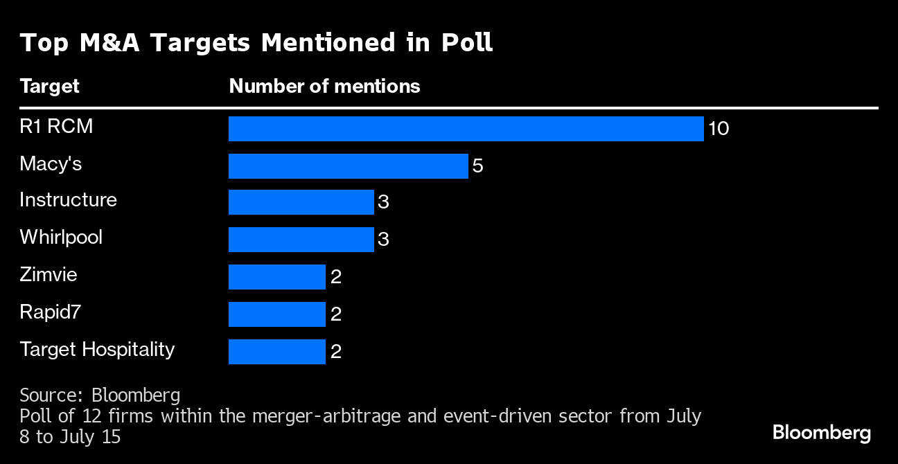 摄影师:David Paul Morris/Bloomberg并购套利投资者正在押注第三季度的仅有少数几笔交易,包括潜在收购R1 RCM公司和梅西百货公司,在年初遭遇困难后,监管、法律和政治障碍延迟或直接阻挠大宗交易。