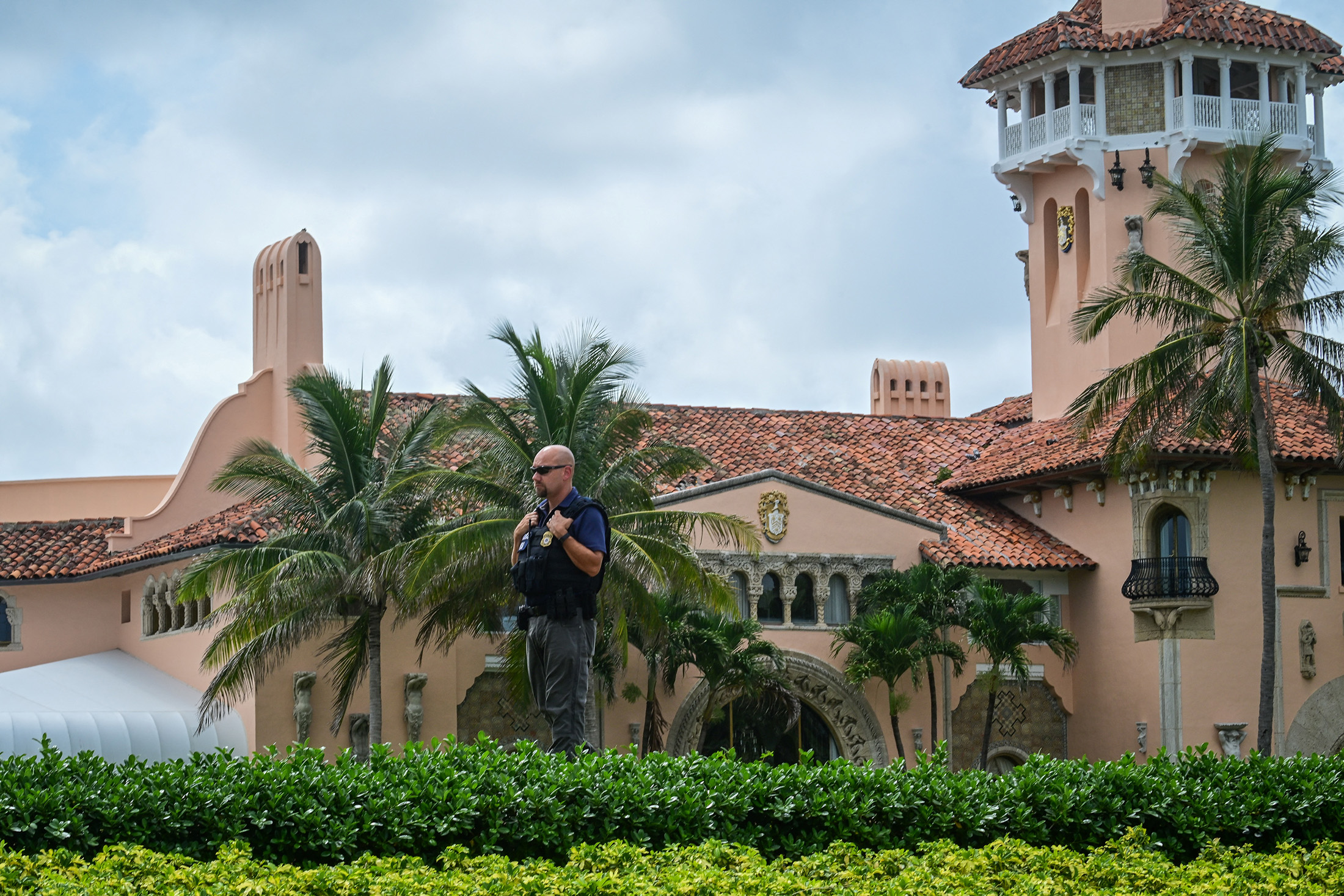 一名警察站在佛罗里达州西棕榈滩的唐纳德·特朗普马阿拉戈度假胜地,7月14日。