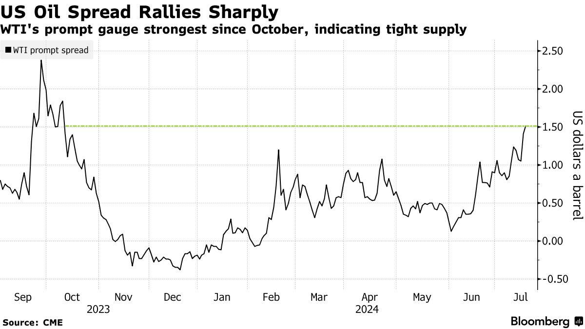 美国基准西德克萨斯中质原油(West Texas Intermediate)当月期货与下一合约之间的溢价——即所谓的即期价差——飙升至每桶1.60美元,创下去年十月以来的最高水平。
