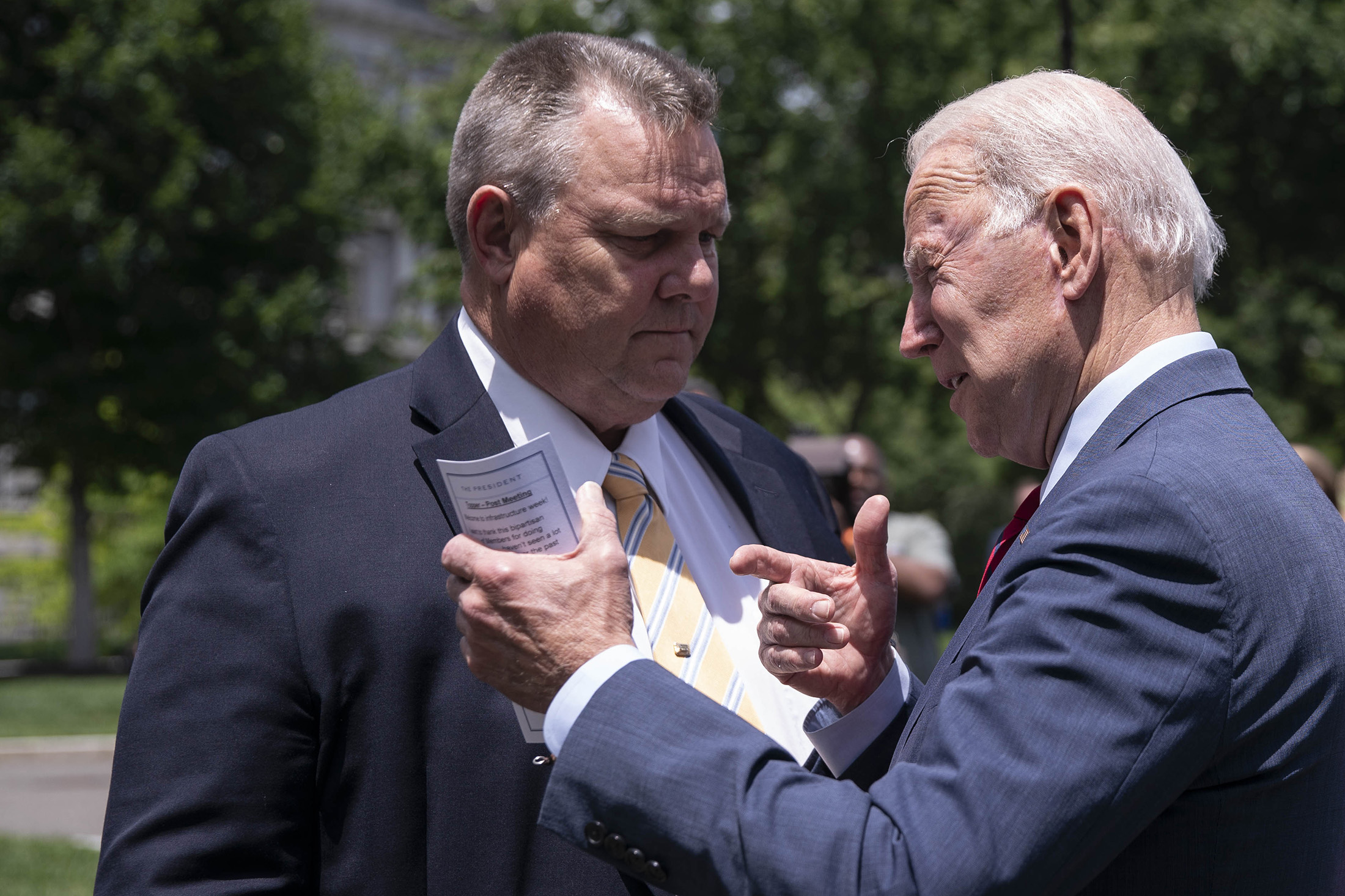 乔·拜登在2021年在白宫外与乔恩·特斯特交谈。摄影师:Sarah Silbiger/UPI/Bloomberg