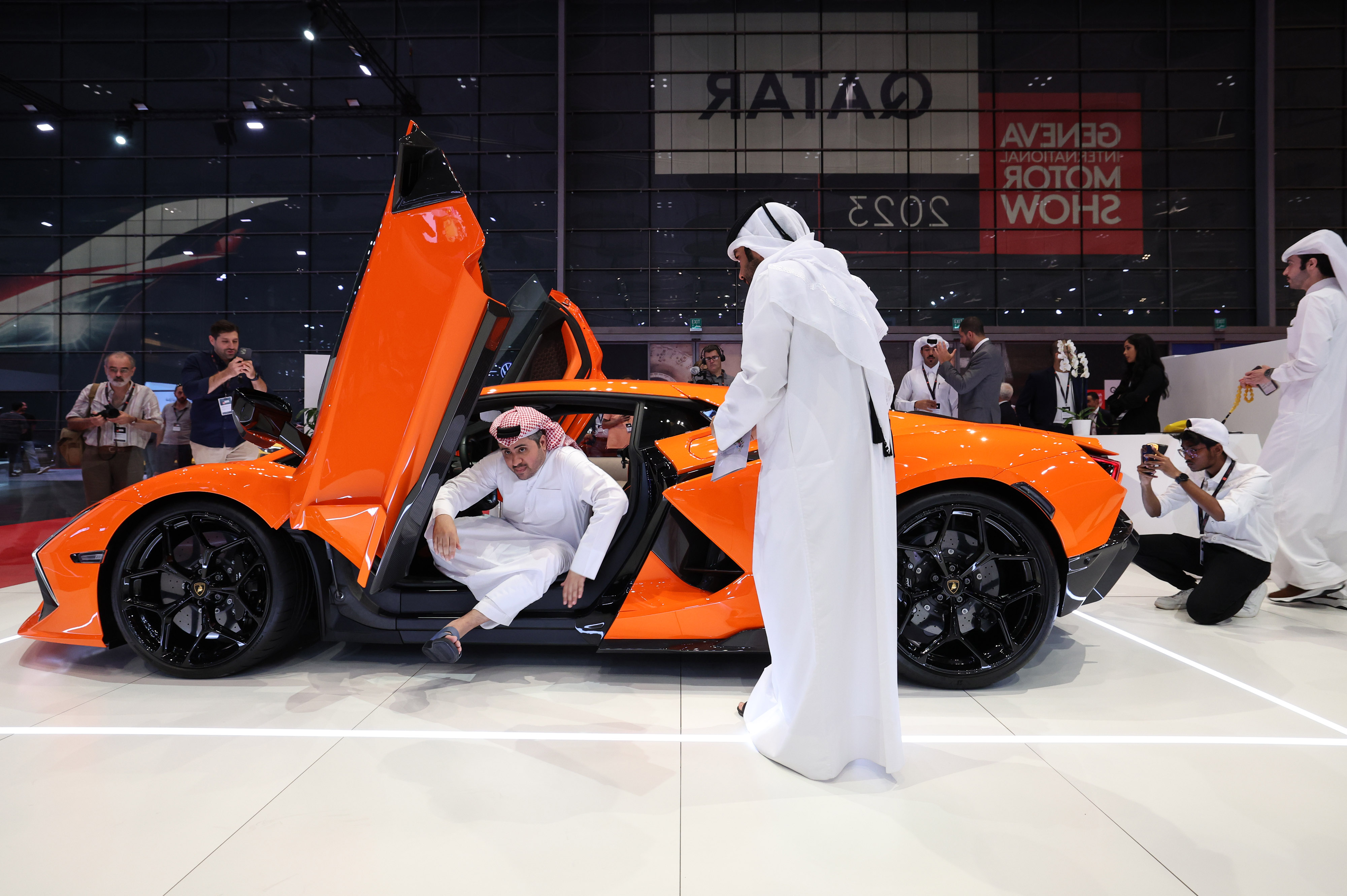 参观者在2023年日内瓦国际汽车展卡塔尔开幕日检查了一辆兰博基尼Revuelto。