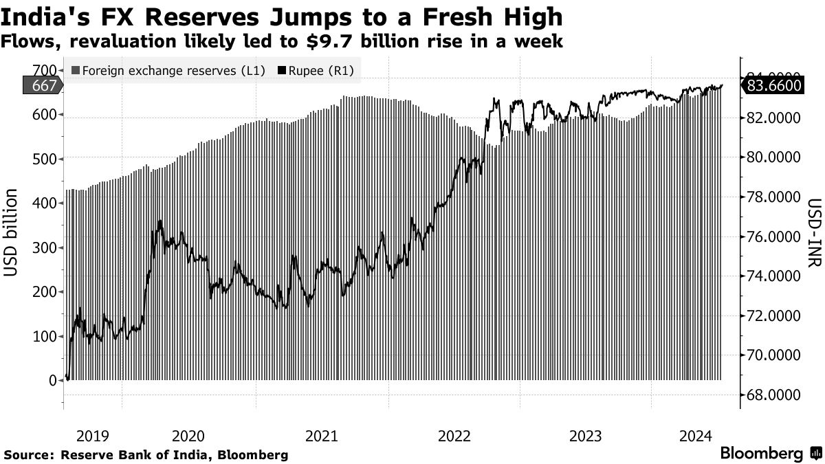 根据印度储备银行周五公布的数据,截至7月12日,外汇储备增加了97亿美元,达到6669亿美元。