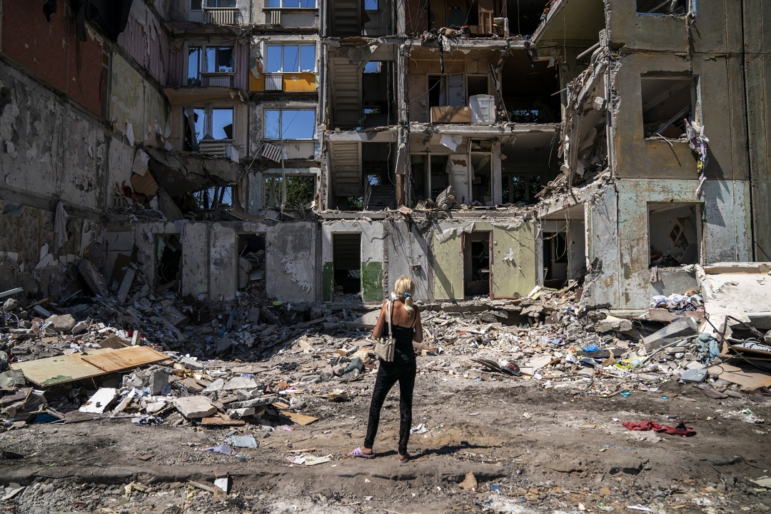 俄罗斯导弹袭击后,乌克兰Myrnohrad的一座建筑在废墟中受损。