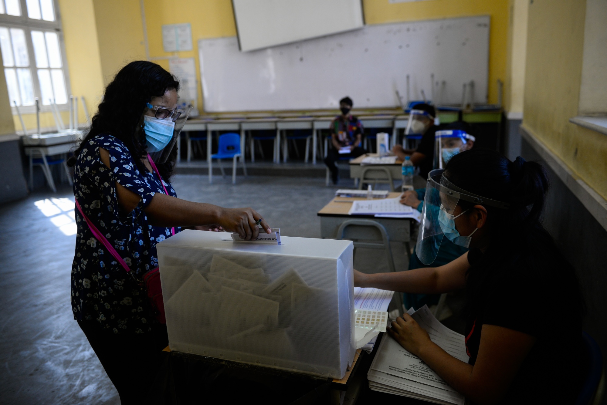 一名选民在2021年在秘鲁利马的一个投票站投票。摄影师:Miguel Yovera/Bloomberg