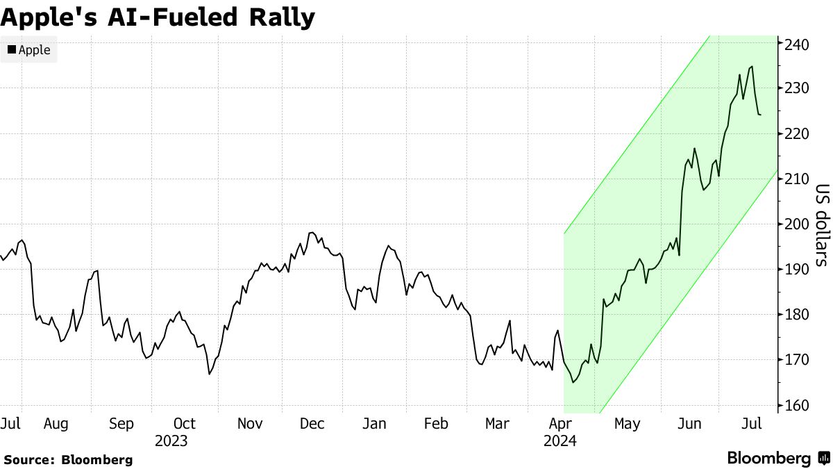 对人工智能活动的积极回应导致股价自4月低点以来上涨了36%,为苹果的市值增加了约9000亿美元,并使其重新成为全球最大股票。这也推高了估值超过历史水平,表明对人工智能寄予厚望,同时也给更广泛市场带来了高风险,考虑到苹果在指数中的巨大权重。