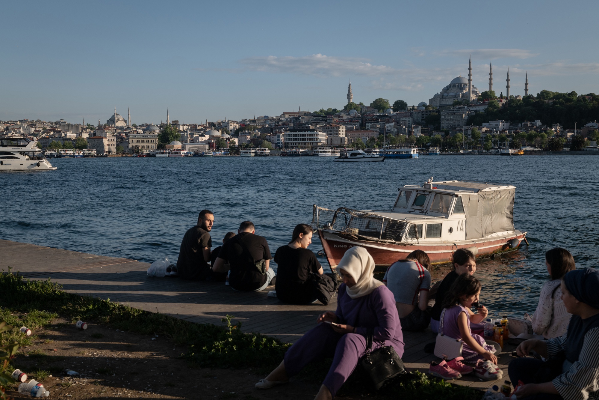 游客们在土耳其伊斯坦布尔的金角湾旁野餐。