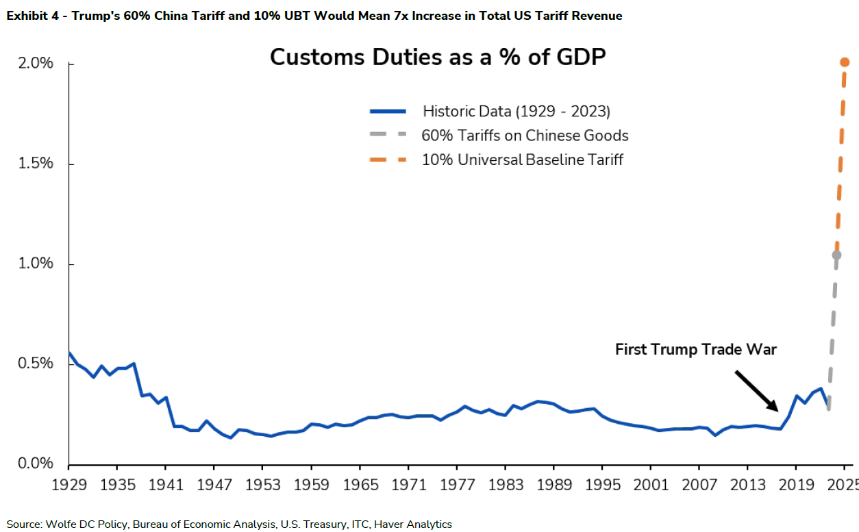 对所有中国进口征收60%的关税,再加上特朗普团队提出的对所有其他国家征收的10%的基准关税,将使美国的加权平均关税率接近17%,这是自1930年代斯穆特-霍利时代以来最高的,据担任拜登政府美国贸易代表办公室的比安基称。