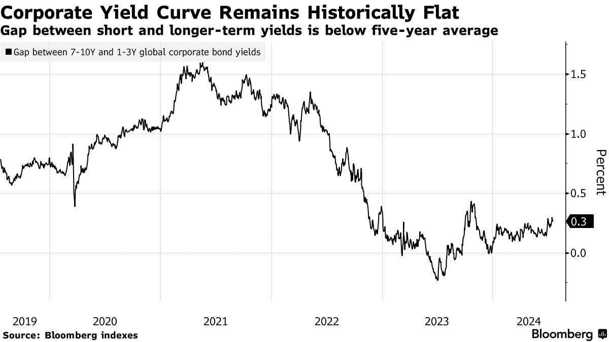 尽管今年利差已经扩大,但仍远低于主要央行开始加息以应对通货膨胀失控之前的水平。目前,根据彭博指数,持有七至十年期全球公司债券而不是较短期公司票据的债券持有人仅获得微薄的30个基点额外收益,而在2021年特朗普离任之前仅为110个基点。