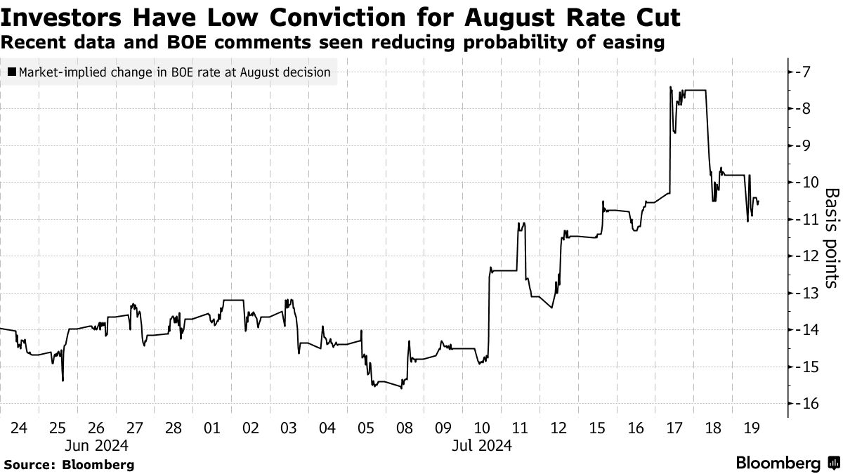根据那次会议的记录,对于不降低借贷成本的判断对一些人来说“非常微妙”。这引发了对8月份可能会采取行动的猜测,尽管交易员现在只看到了40%的机会,因为数据显示通胀压力仍在持续。