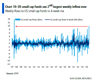 标普500指数数月来一直在上涨 — 自去年10月底的近期低点以来,在38周中有28周上涨 — 基金经理开始增加对科技巨头之外行业的敞口。根据EPFR Global和美国银行编制的数据,小盘股在截至周三的一周内录得了有史以来第二大的资金流入,达到99亿美元。