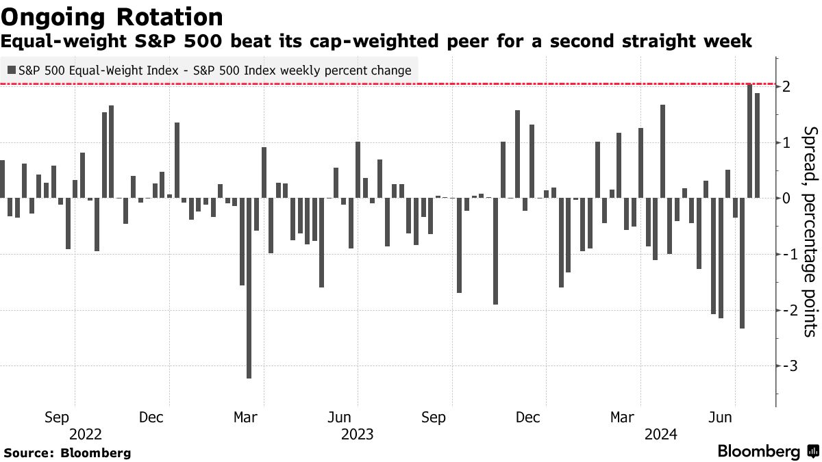 一个去除市值偏见的标普500指数版本刚刚经历了相对于标普500指数自2020年11月以来最佳的两周表现。这对于这个一直落后于基准指数的等权重指数来说是一个显著的转变,这也是因为对最终货币宽松的乐观情绪正在将投资者从大型科技股的被视为安全的地方推开。