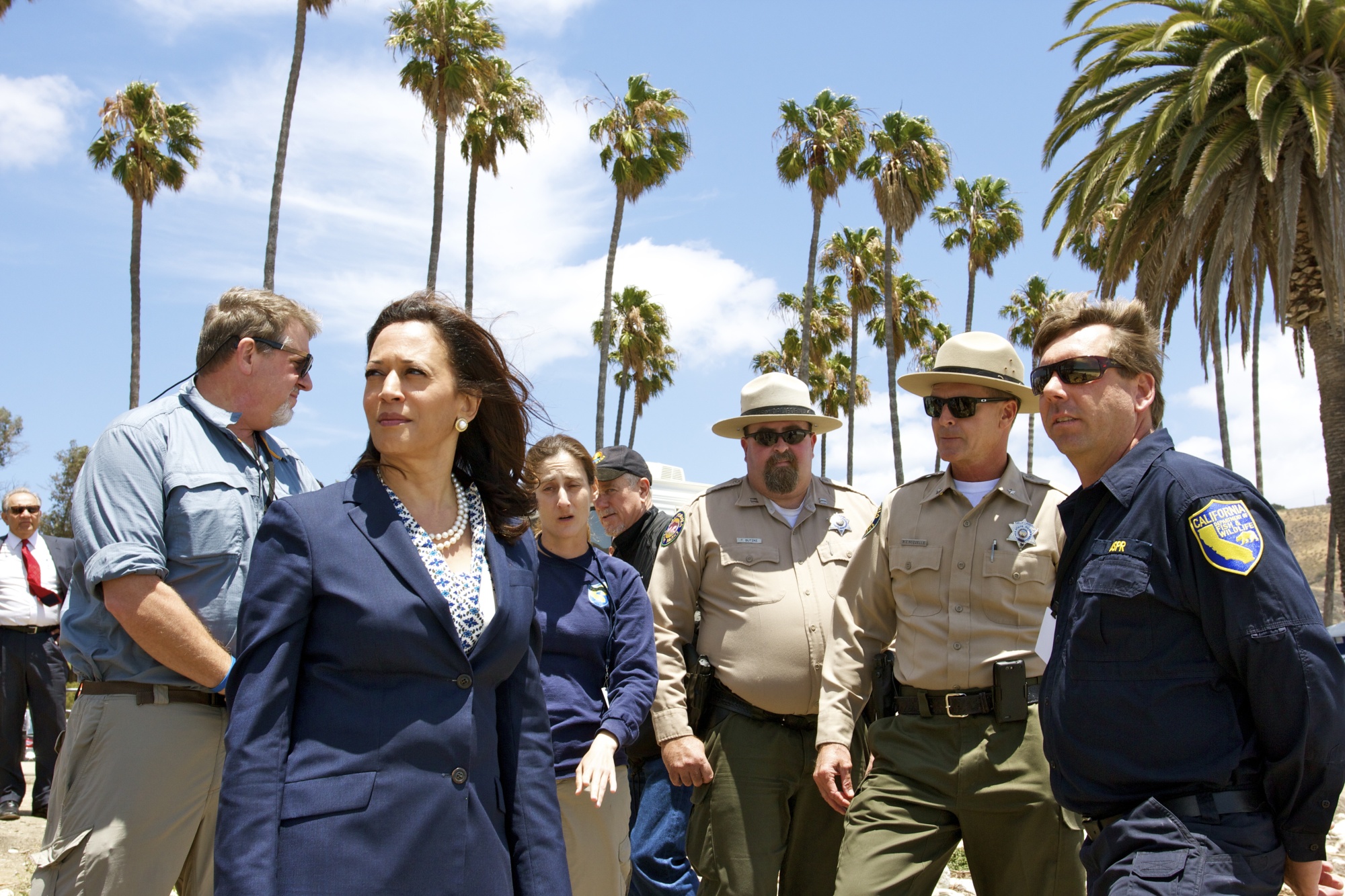 卡玛拉·哈里斯参观了2015年6月石油泄漏影响的Refugio State Beach和周边地区的清理工作。