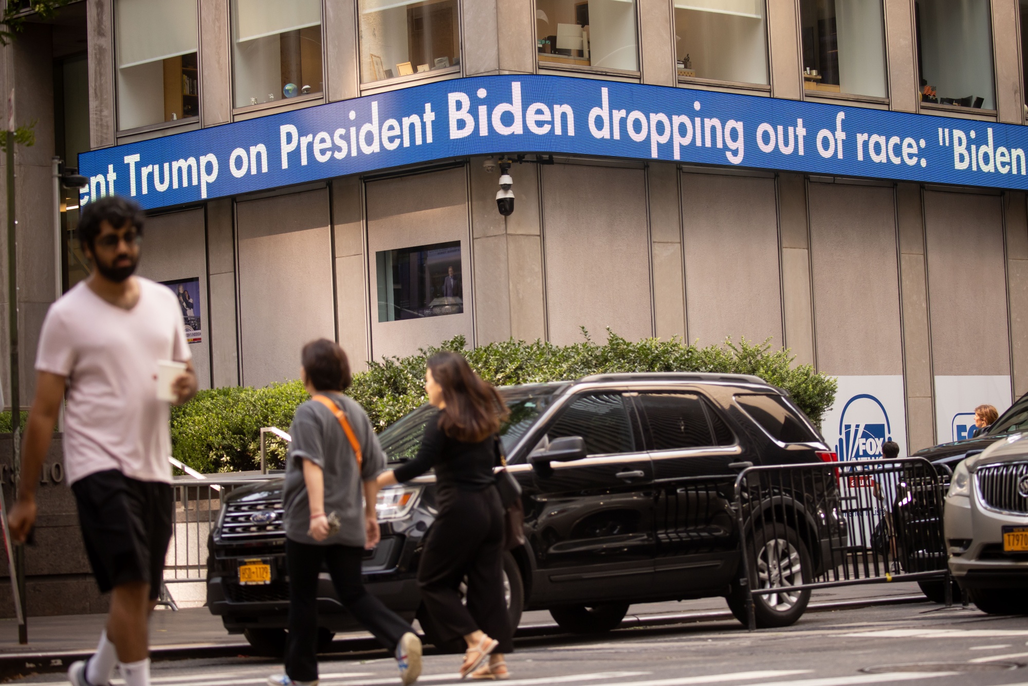 屏幕显示新闻报道,报道称拜登于7月21日退出2024年总统竞选。摄影师:迈克尔·纳格尔/彭博社早上做出决定后,拜登给哈里斯、白宫幕僚长杰夫·齐恩茨和奥马利·迪龙打电话通知,并与他在雷霍博斯海滩的团队起草了一封公告信。