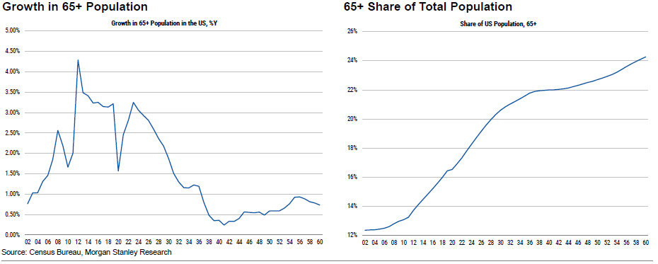 问题不会消失。美国65岁以上人口的比例将会增加。以下图表来自摩根士丹利的一份名为“美国的长寿”报告: