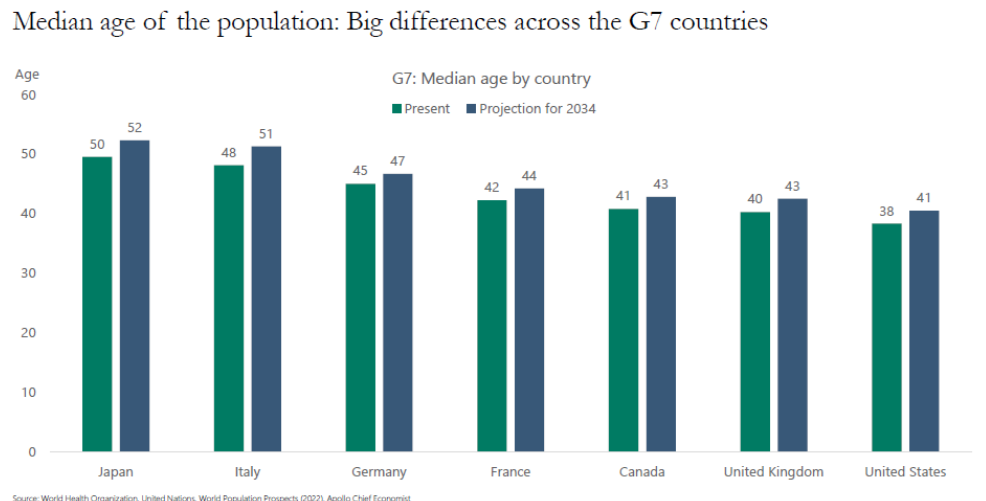 虽然目前的焦点在美国,但该国比最富裕国家中的同行更年轻。美国的中位年龄仍然低于40岁。在日本,中位年龄已达到50岁,意大利预计将在本十年末跟随。以下图表来自阿波罗集团首席经济学家托斯滕·斯洛克: