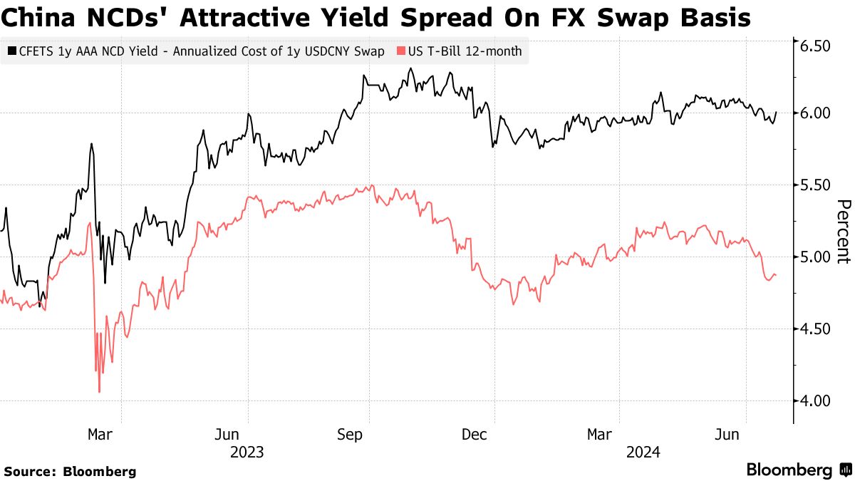 尽管拥有AAA信用评级的中国银行一年期NCD的收益率已降至略低于2%,但海外买家从在岸交易员支付的人民币兑换美元费用中获得了额外收益,使其预期收益率达到约6%,根据彭博编制的数据。考虑到等值的国债回报率已回落至约4.9%,这是一个有吸引力的选择。