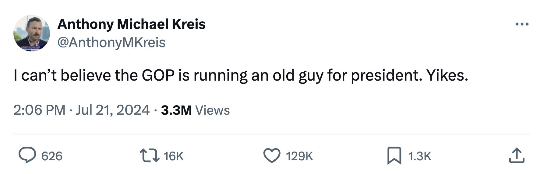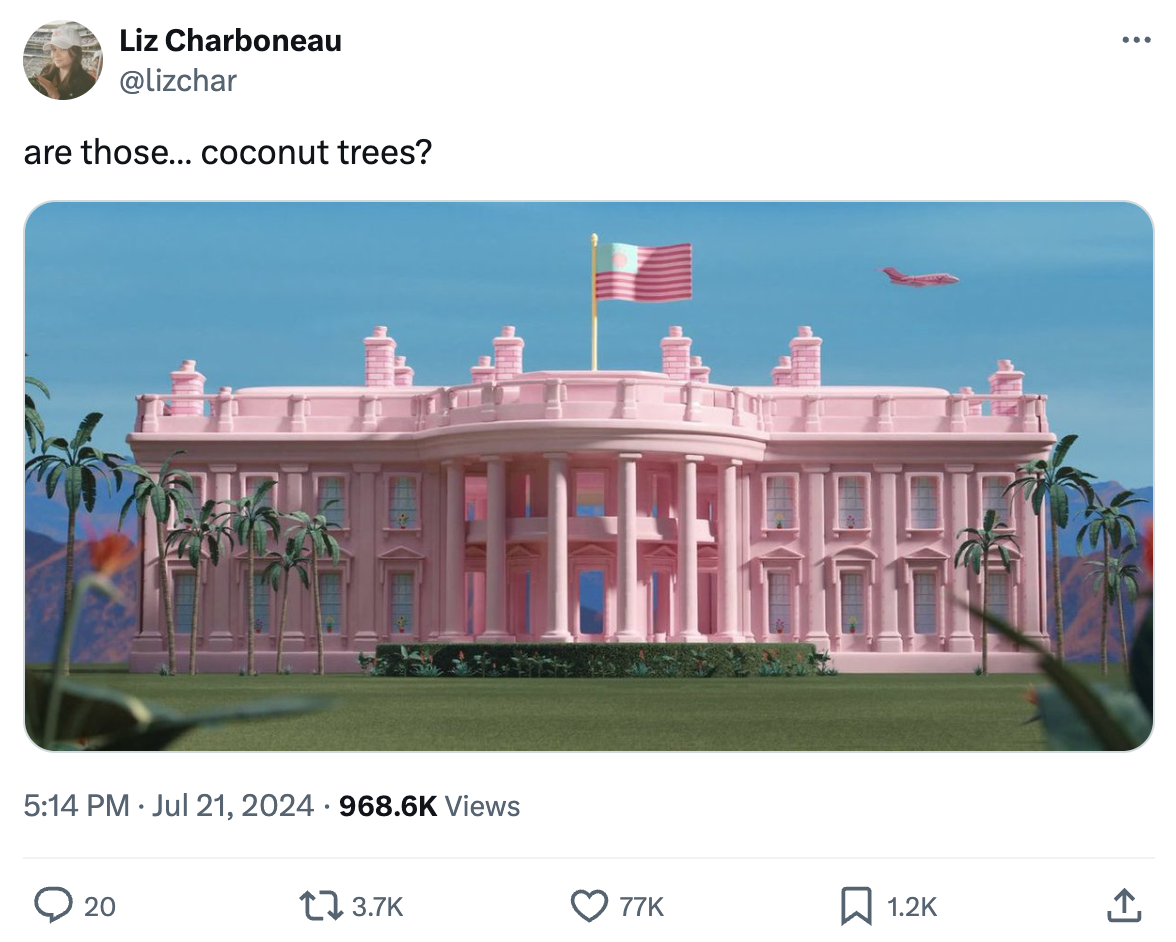 现在,民主党可以支持一位新的公职人员。“赔率,民意调查,政治和财政策划以及总统的背书都有利于副总统卡玛拉·哈里斯接替拜登的位置,” Tim写道。正如帕特里夏·洛佩兹在拜登-特朗普辩论之后指出的,哈里斯可以“轻松揭穿特朗普的谎言和支离破碎的胡言乱语。” 她参加这场竞选完全颠覆了特朗普针对一个年迈对手的策略。现在,他是那个年迈的对手,背负着两次弹劾、一项刑事定罪和无数诉讼。