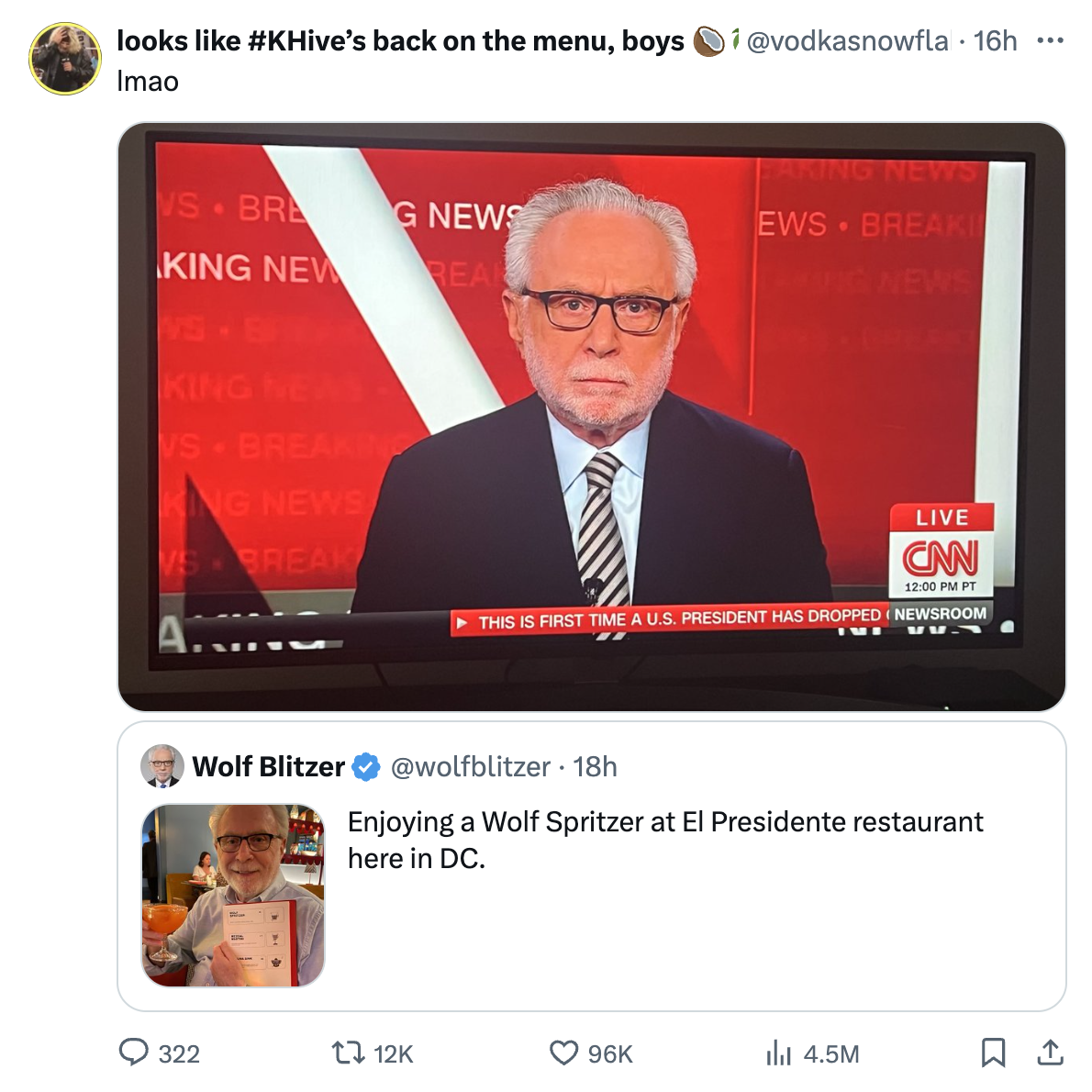 我当时正在沙发上吃快熟通心粉。其他人可能在 农贸市场。Wolf Blitzer则在El Presidente餐厅享用以他命名的鸡尾酒。可怜的家伙可能在被 叫回去上班时,不得不把那杯“Wolf Spritzer”打包带走: