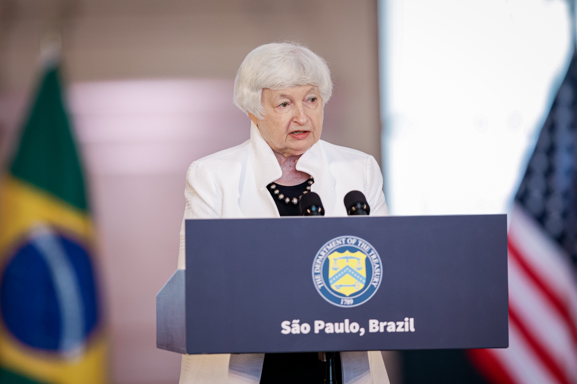 珍妮特·耶伦,美国财政部长,在2024年2月27日访问巴西圣保罗时的照片。
