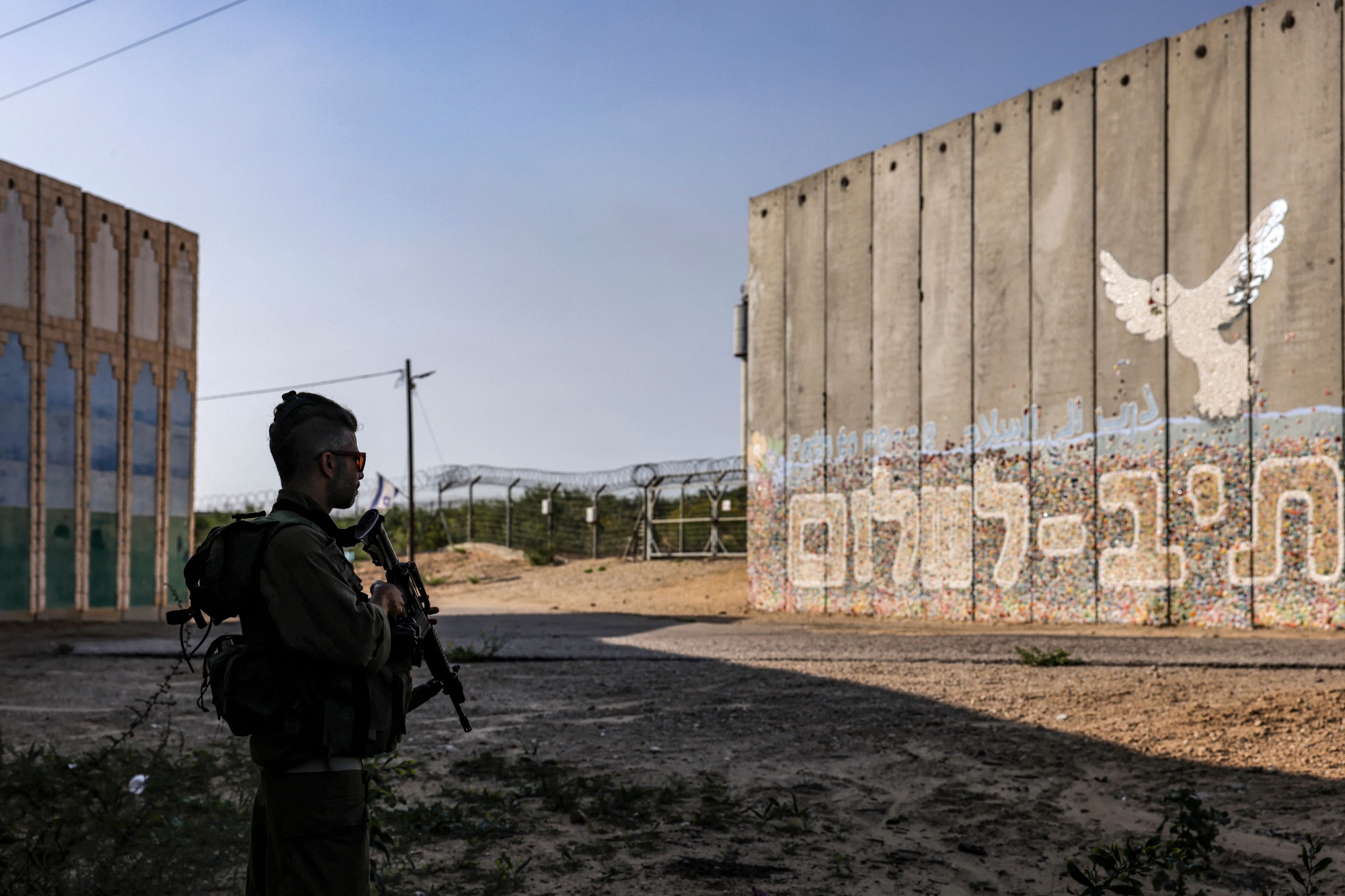 一名以色列士兵在靠近加沙地带边界的Moshav Netiv HaAsara站岗。