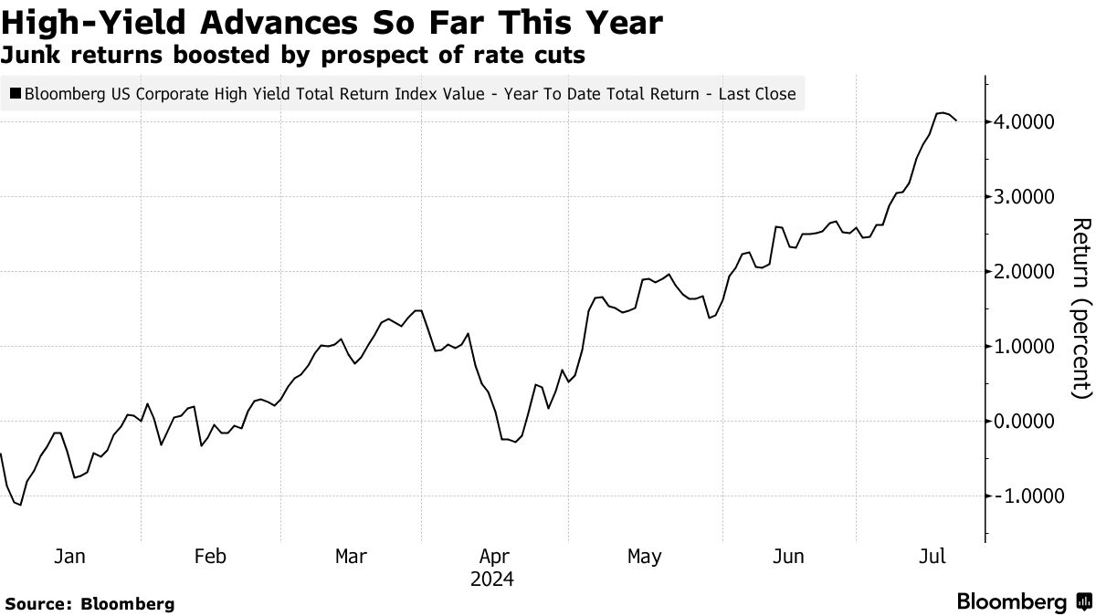 由于新的垃圾债券供应不足,大多数投资者都成为买家,因为今年的回报率非常诱人。根据LSEG Lipper的数据,截至7月17日的一周内,美国高收益债券基金吸引了26.4亿美元,而杠杆贷款基金吸引了12.9亿美元。根据彭博美国公司高收益债券指数,今年迄今为止,高收益债券回报率为4%,而Morningstar LSTA杠杆贷款TR指数已经上涨了4.9%。