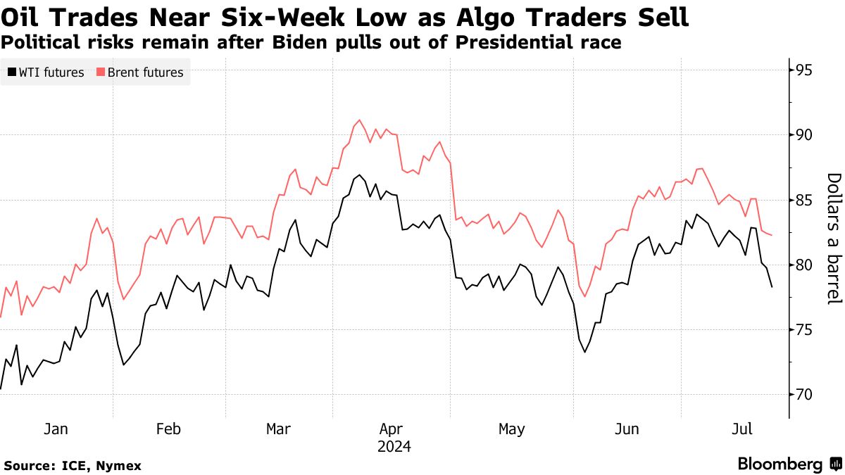 全球基准布伦特原油在前两个交易日下跌超过3%后仍保持在每桶82美元以上,而西德克萨斯中质原油价格接近每桶78美元。这一下跌是由于算法交易员的抛售,以及投资者在权衡乔·拜登放弃总统连任竞选的影响。