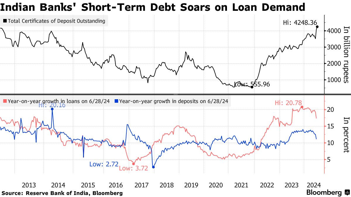 根据印度储备银行最新数据,银行发行的存单金额在截至7月12日的两周内上升到4.3万亿卢比(514亿美元)。这是自2012年6月以来的最高水平,与截至6月28日的一年内银行贷款增长17.4%相比,高于存款11%的增长。