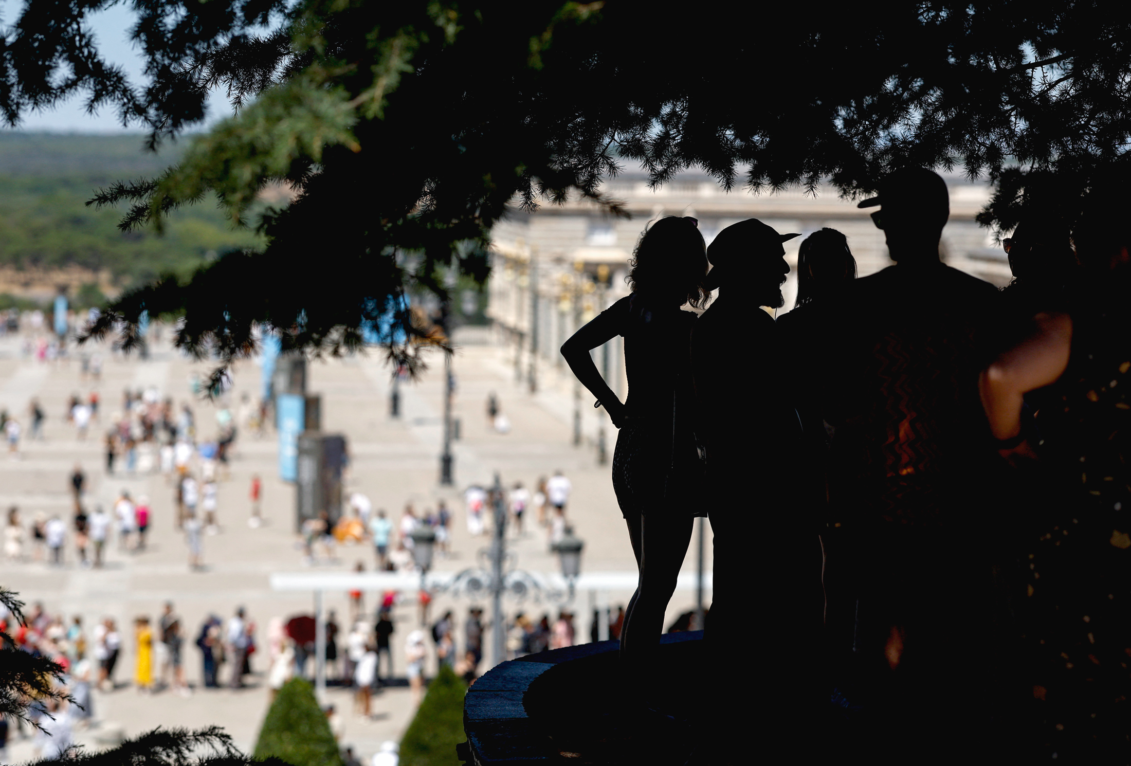 游客们在7月20日在马德里皇宫附近的阴凉处听导游讲解。
