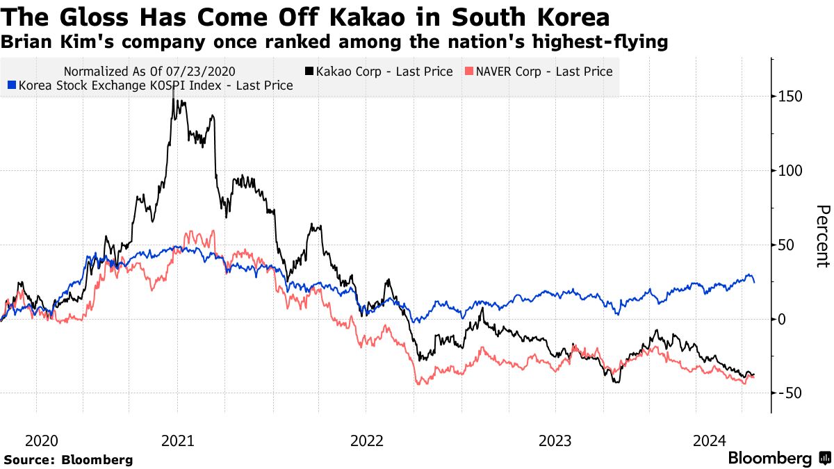 Kakao的股价今年已下跌约四分之一,在周二首尔下跌了5.4%。这使其自2021年创下历史最高点以来的跌幅超过75%,市值损失超过400亿美元。