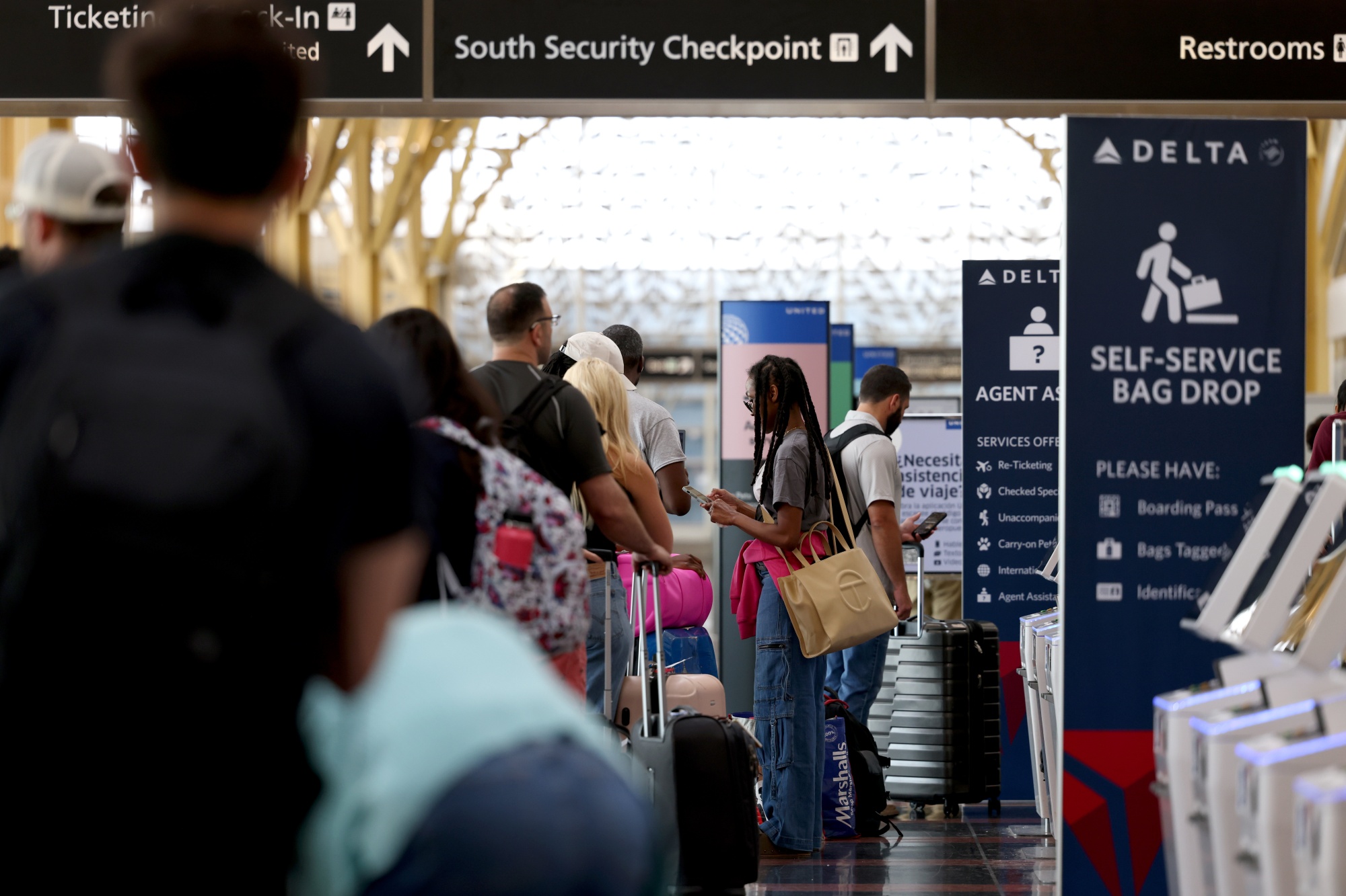 旅客们在7月19日在弗吉尼亚州阿灵顿的罗纳德·里根国家机场排队等候达美航空柜台。