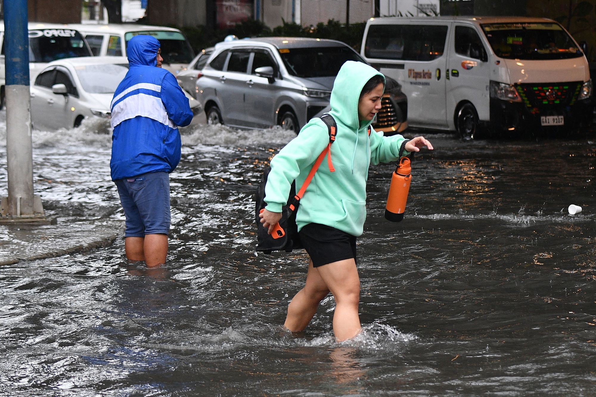 一名行人在7月23日台风嘎密带来的暴雨中涉水穿过一条被淹的街道。摄影师:Ted Aljibe/AFP/Getty Images