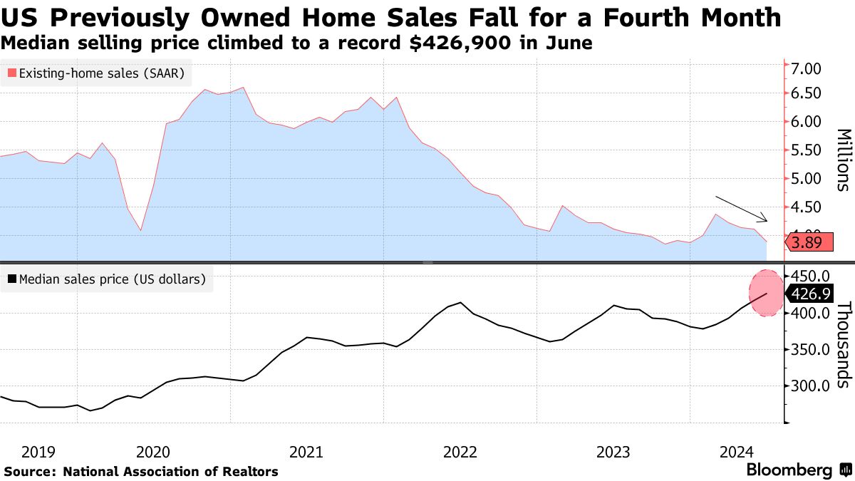 根据美国房地产经纪人协会周二发布的数据显示,合同成交量从5月份下降了5.4%,至每年389万的年化速度。这标志着连续第四个下降,速度低于经济学家在彭博调查中的所有估计。