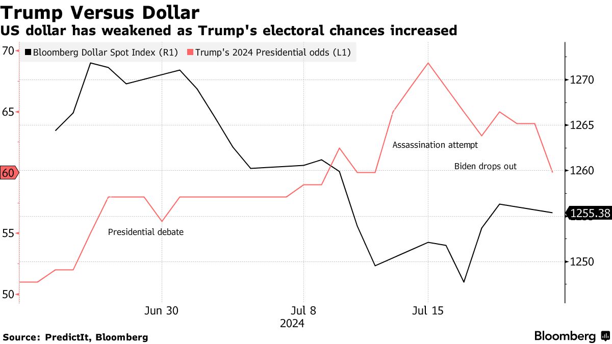 自从拜登总统和特朗普在六月辩论以来,美元基本上与特朗普的胜算呈反向交易,为他的经济计划创造了一个肥沃的土壤,如果他在今年晚些时候宣布胜利。特朗普本月接受彭博商业周刊采访时表示,美元的强势正在损害美国出口,这导致该货币达到了近两个月的低点。