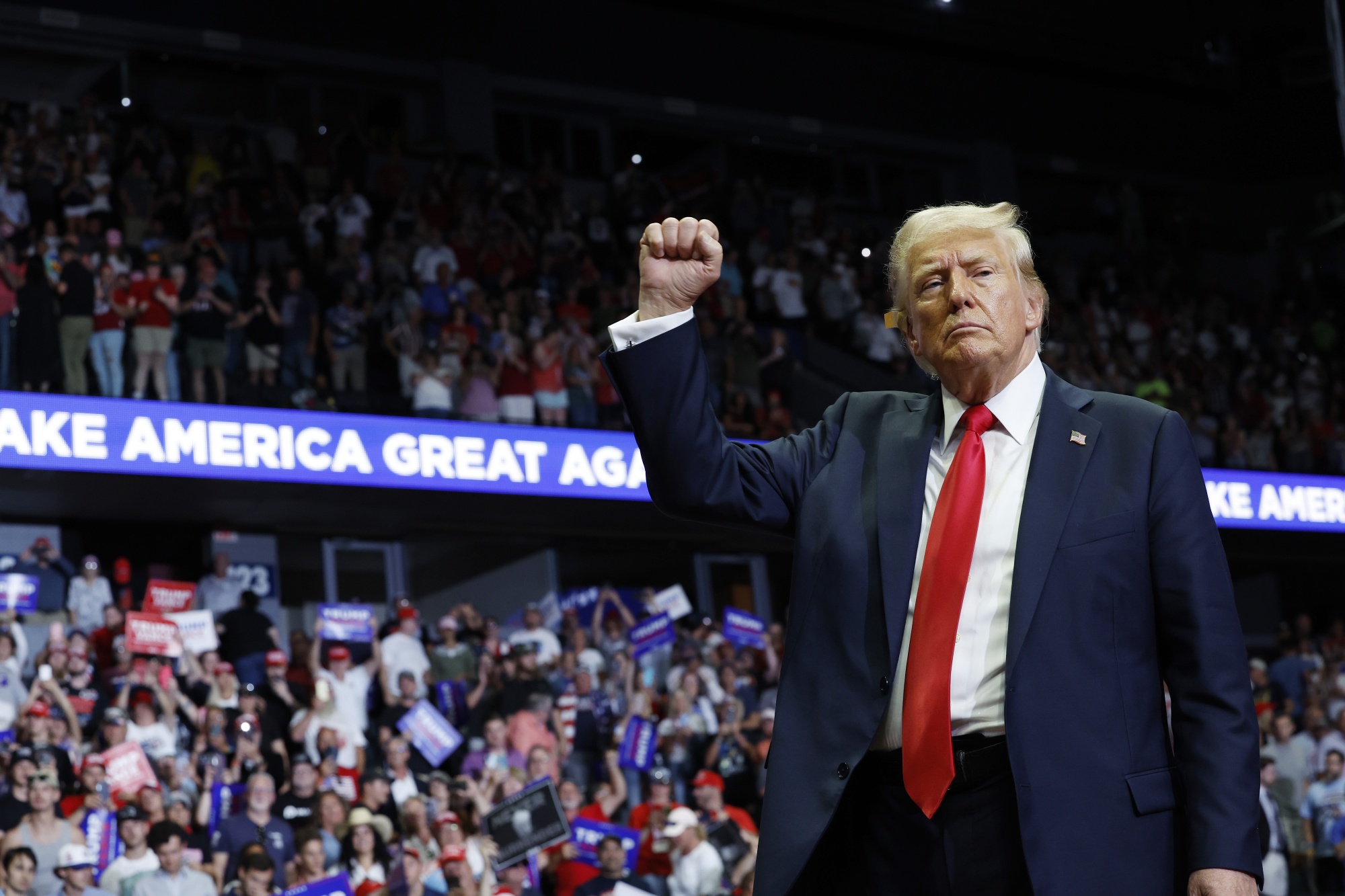 唐纳德·特朗普在7月20日在密歇根州大急流城的竞选集会上讲话后离开舞台。