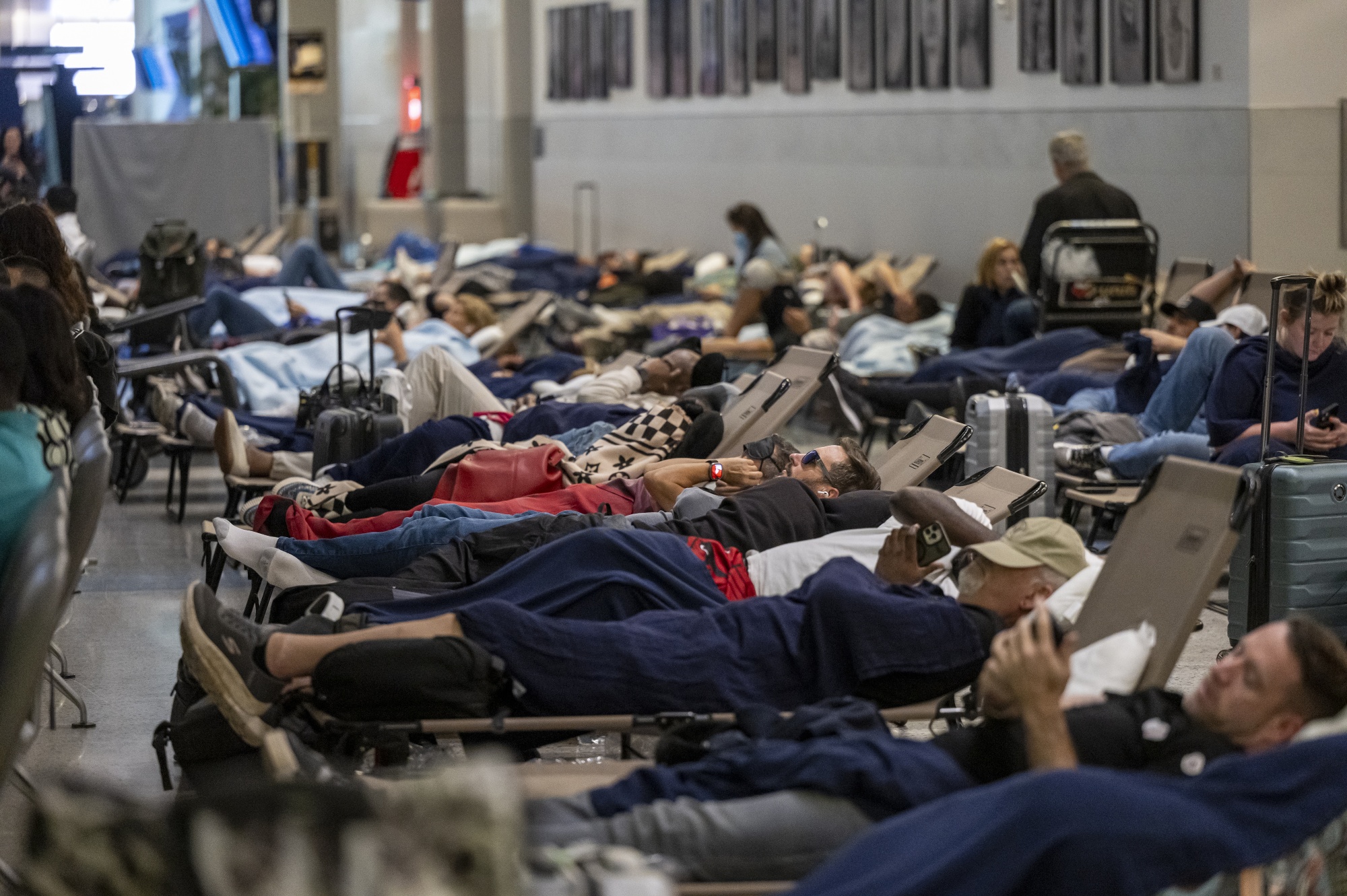 乘客们在乔治·布什国际机场休息,位于美国德克萨斯州休斯顿,2024年7月19日星期五。全球各地的航空公司在一场大规模的全球计算机故障之后经历了前所未有的混乱,导致飞机停飞,机场陷入混乱。摄影师:大卫·保罗·莫里斯/彭博社