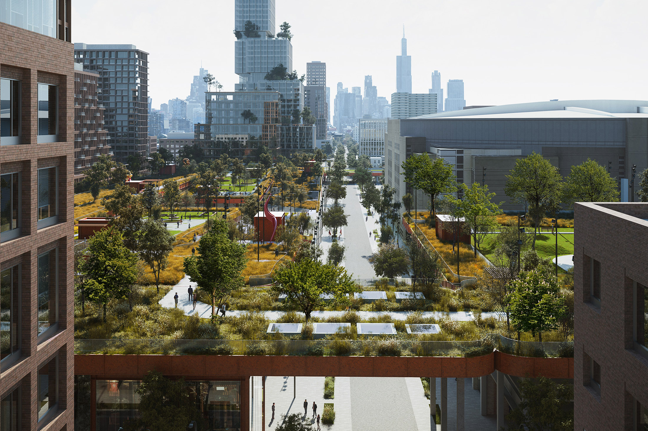 1901项目中一个绿色空间的效果图。来源:RIOS联合中心毗邻该市的一个税收增值融资区,允许开发商通过额外产生的房产税收来收回一些成本。Savarise表示,该团队愿意与市政府就TIF基金如何支持项目的交通或基础设施改进进行对话。