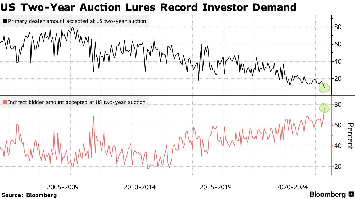美国财政部两年期国债在拍卖中创下投资者需求的纪录-彭博报道